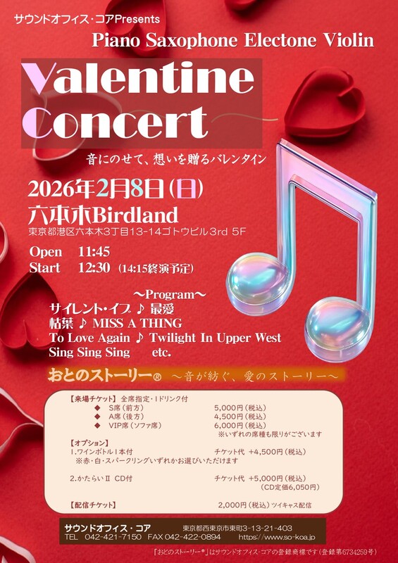 2/8 12:30-六本木バードランドにてバレンタインコンサートを開催いたします。「音にのせて、想いを贈るバレンタイン」と題して、ピアノ、サクソフォーン、エレクトーン、バイオリンの演奏をお楽しみいただけます。会場にお越しになれない方には、配信チケットのご用意がございます。コンサート詳細https://www.so-koa.jp/010/-1-50.html ツイキャス(配信)チケットのお申込みht…