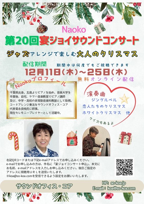 Naoko宴ジョイサウンドコンサートのご案内です!12/11(木)~25(木)まで弊社プレイヤーNaokoのコンサートがオンラインで開催されます。視聴料金は無料です。この時期に合ったクリスマス曲を演奏します♪是非、下記URLよりお申し込みくださいませ(^^♪https://forms.gle/e6qQEP3fu4LHca9K6※ご視聴URLをお送りいたしますので、メールアドレス「koa@so-ko…