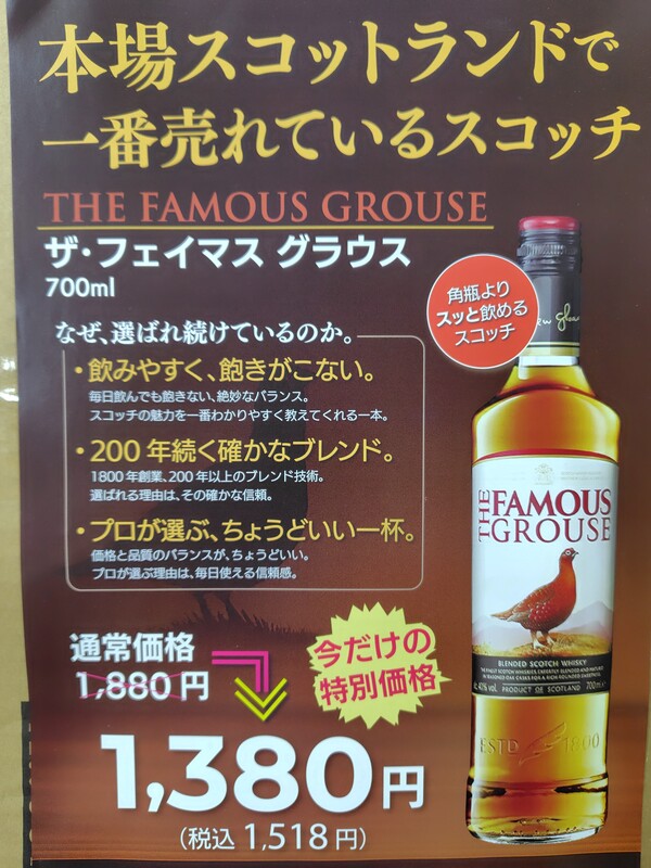 ザ・フェイマスグラウス 700ml1本 1,380円 税込み1,518円数量限定につき事前にご予約下さい。
